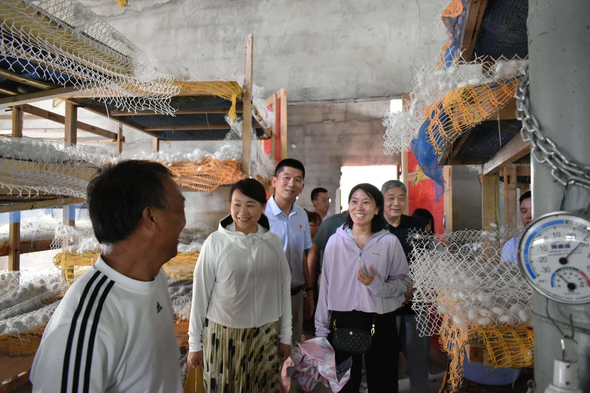 在公司驻宝山村第一书记兼工作队队长王峰、驻村干部庆晓勇的精心组织安排下,两院师生首先参观了巩固脱贫攻坚成果有效衔接乡村振兴的帮扶项目—新润农牧有限公司高山茶园茶厂,万达农业开发有限责任公司生态桑园蚕场,负责同志详细介绍了在公司与当地政府的支持下,他们如何应用现代化科学技术推广生产模式,延长产业链条,提高经济收入。鲜活的事例和现场的学习,使大家都对以特色产业振兴,进而推动乡村全面振兴有了更清晰直观的认识。