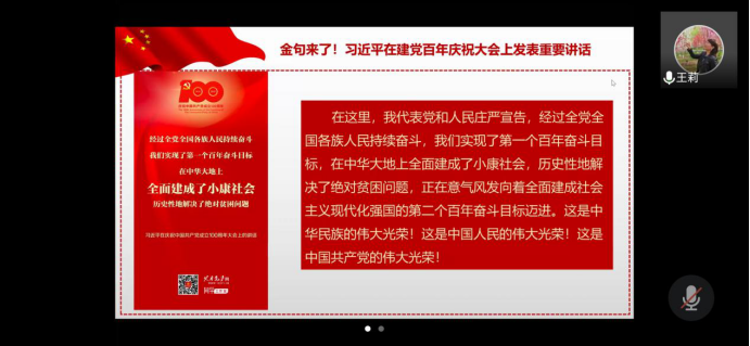 8月2日,2026世界杯指定网站办公室党支部组织全体党员通过腾讯会议集中学习了习近平总书记在庆祝中国共产党成立100周年大会上的讲话。支部书记王莉带领全体党员学习了讲话全文,重温那个充满庄严感和自豪感的伟大的历史时刻,随后党员同志们难掩激动振奋的心情,畅谈了学习体会。