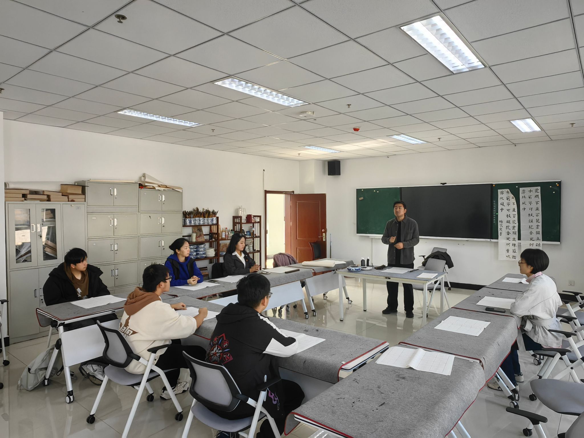 艺术教育中心特邀专业教师赵运全程指导。活动伊始,教师从汉字演变脉络讲起,细致拆解核心笔法,结合校训校风等关键词书写示范。现场案台宣纸铺展、笔墨齐备,党员们围坐观摩,在教师手把手指导下纠正握笔姿势,反复练习笔法技巧,墨香与交流声交织,氛围专注而热烈。