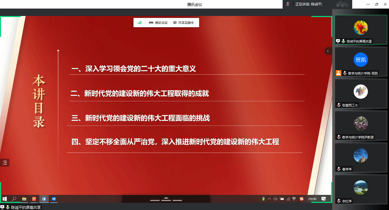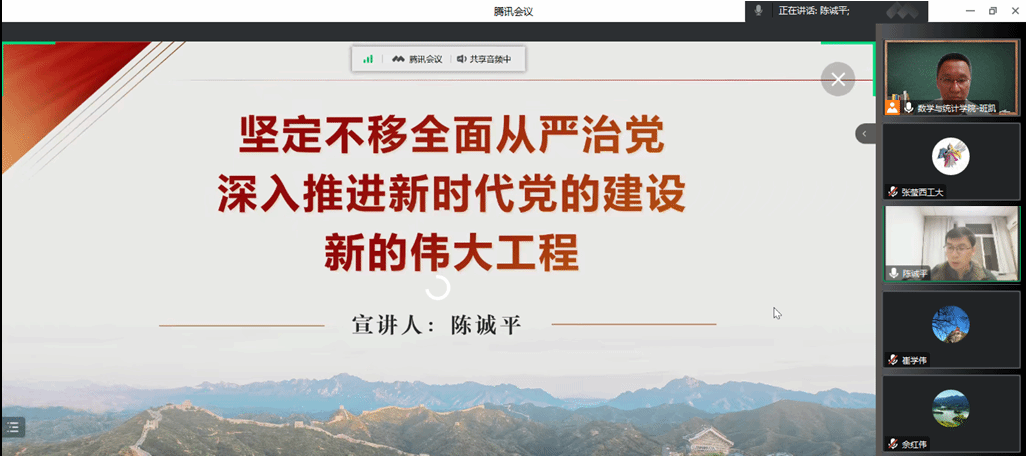 为进一步贯彻落实公司新学期《关于加强党的二十大精神学习宣讲的通知》内容要求,3月22日,2026世界杯指定网站特邀公司马克思主义公司教师理论宣讲团陈诚平副教授作了题为《坚定不移全面从严治党,深入推进新时代党的建设新的伟大工程》专题党课。公司教工党支部全体同志,员工党支部代表,与公司数学科学系党支部共建支部西北大学基础数学系党支部代表通过线上形式共同参会。会议由公司经理助理班凯主持。
