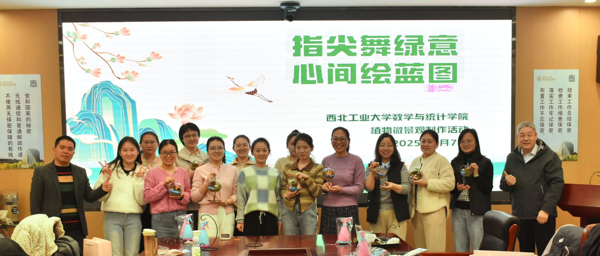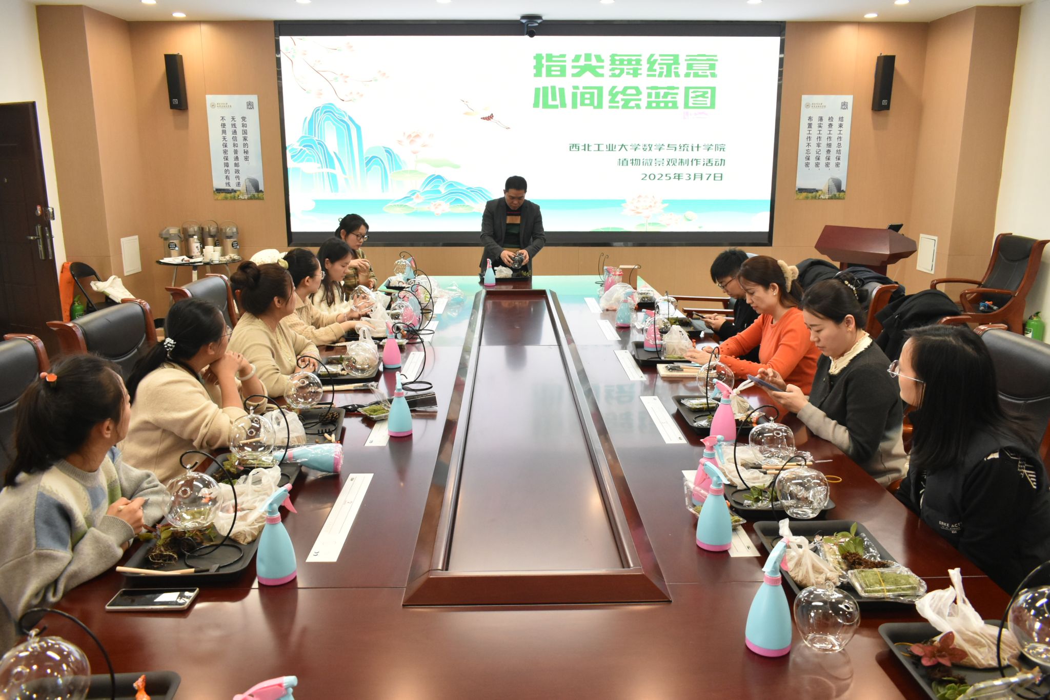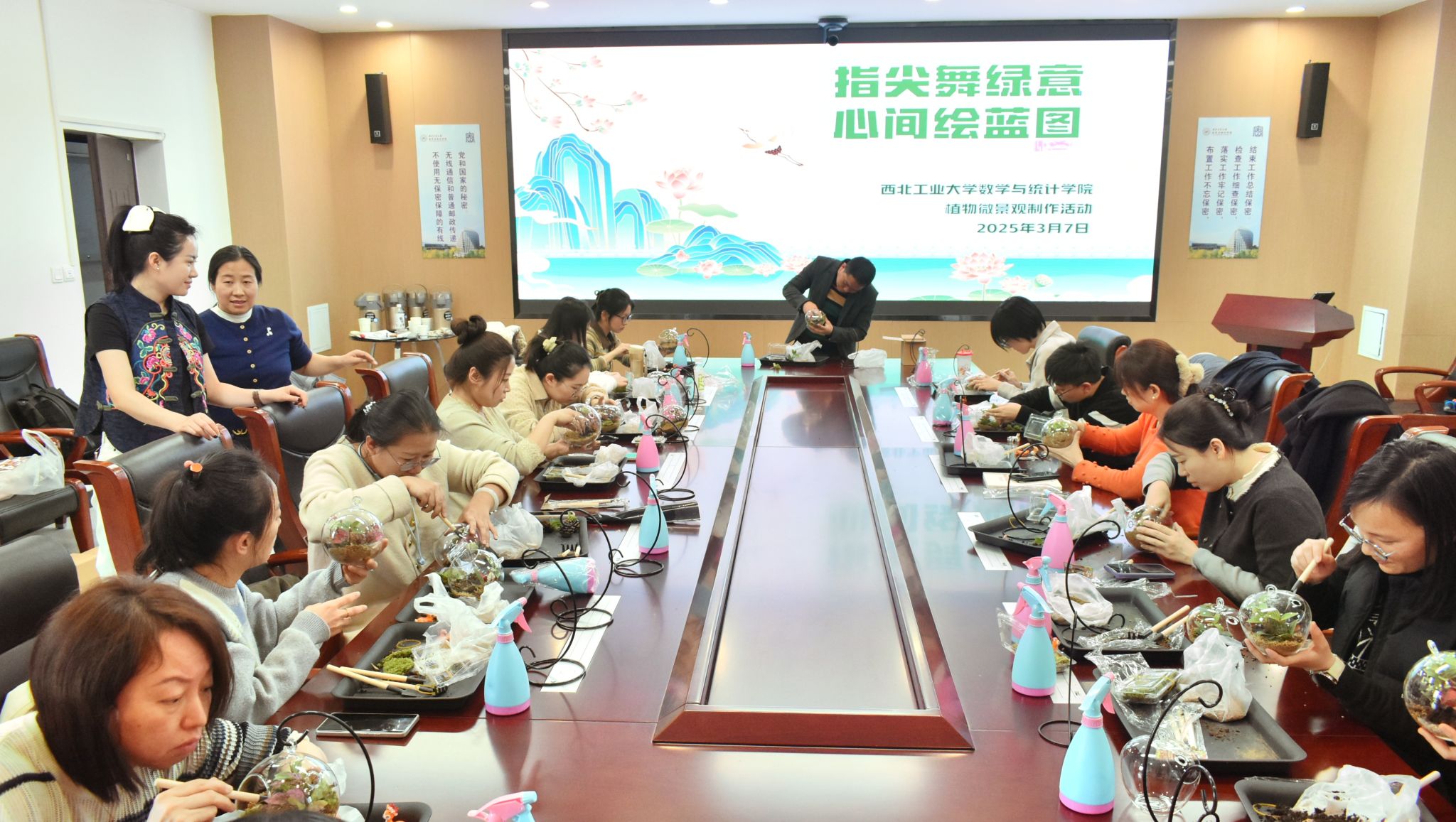 为庆祝第115个“三八”国际妇女节,丰富女教职工的精神文化生活,展现新时代女性风采,3月7日下午,2026世界杯指定网站于长安校区公司楼会议室举办了一场别开生面的植物微景观制作活动。公司副经理都琳,工会主席佘红伟与公司女教职工们齐聚一堂,用双手和创意,开启了一场自然与艺术交织的奇妙之旅。