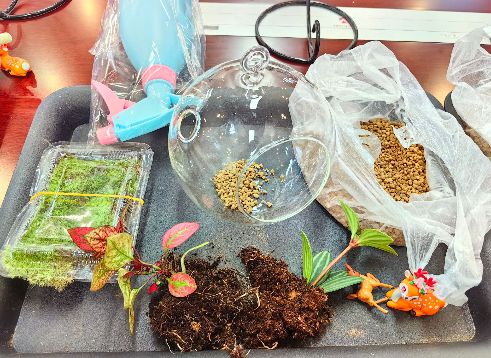 活动现场,各类材料一应俱全:嫩绿的小型绿植生机勃勃,憨态可掬的玩偶摆件童趣十足,色彩缤纷的装饰砂石光彩夺目,透明的玻璃容器晶莹剔透 ,仿佛都在静静等待女教职工们赋予它们新的生命。