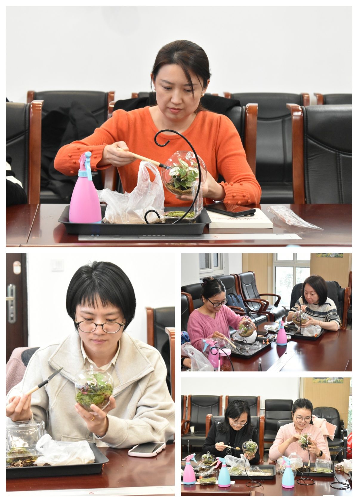 首先专业老师详细讲解了微景观的制作方法,从植物的挑选与搭配,到砂石的铺设技巧,再到整体构图的设计思路。女教职工们认真聆听,不时提出问题,与老师互动交流。在制作过程中,大家充分发挥自己的想象力和创造力,宛如一个个专业的园艺设计师。有的女教职工通过混合搭配营造出宁静的森林氛围;有的则加入可爱的卡通玩偶,打造出充满童趣的梦幻场景;还有的运用不同颜色的砂石,铺就出富有层次感的“大地”与“海洋”。大家相互协作,分享制作心得,现场欢声笑语不断。