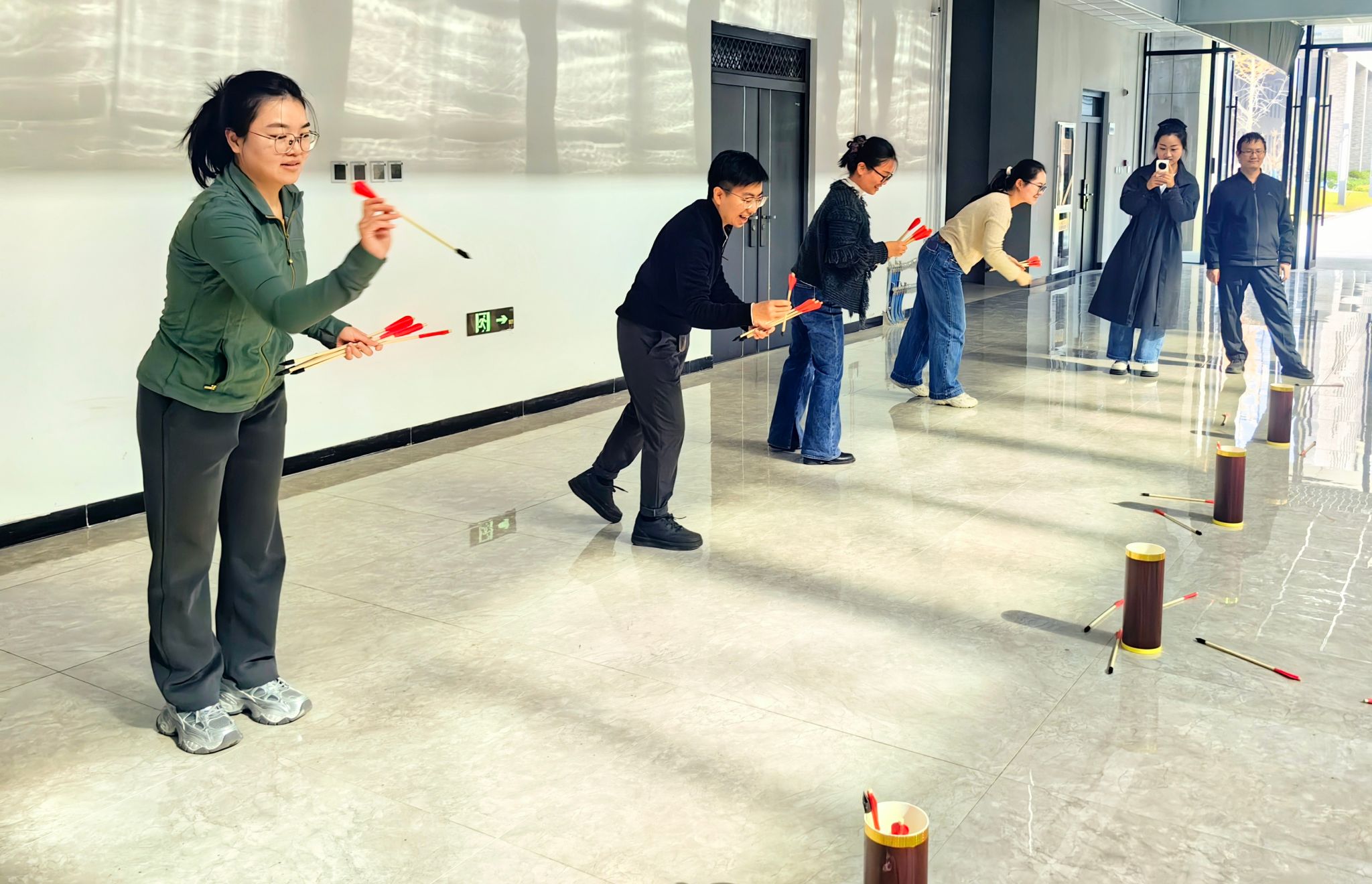 “投壶掷准”区域则上演着“古典智慧与现代数学”的碰撞。老师们手持箭矢,在瞄准、投掷的过程中不自觉运用几何角度,将昔日黑板上的“抛物线公式”,变成此刻手中的“精准投掷指南”。大家笑称:“古代投壶里也蕴含着数学奥秘,这真是一场生动的数学文化课。”