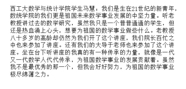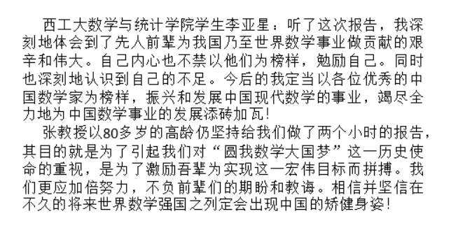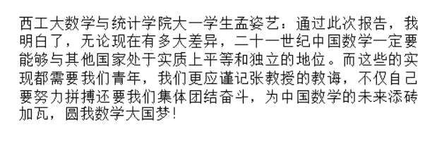 还有网友写道:“张老师,我周围听讲的同学都觉得收获非常大,尤其是您对中国数学的现状以及落后原因的分析,让同学们极大地开阔了视野,跳出对书本的学习,真正去关心我国数学发展的现状”。