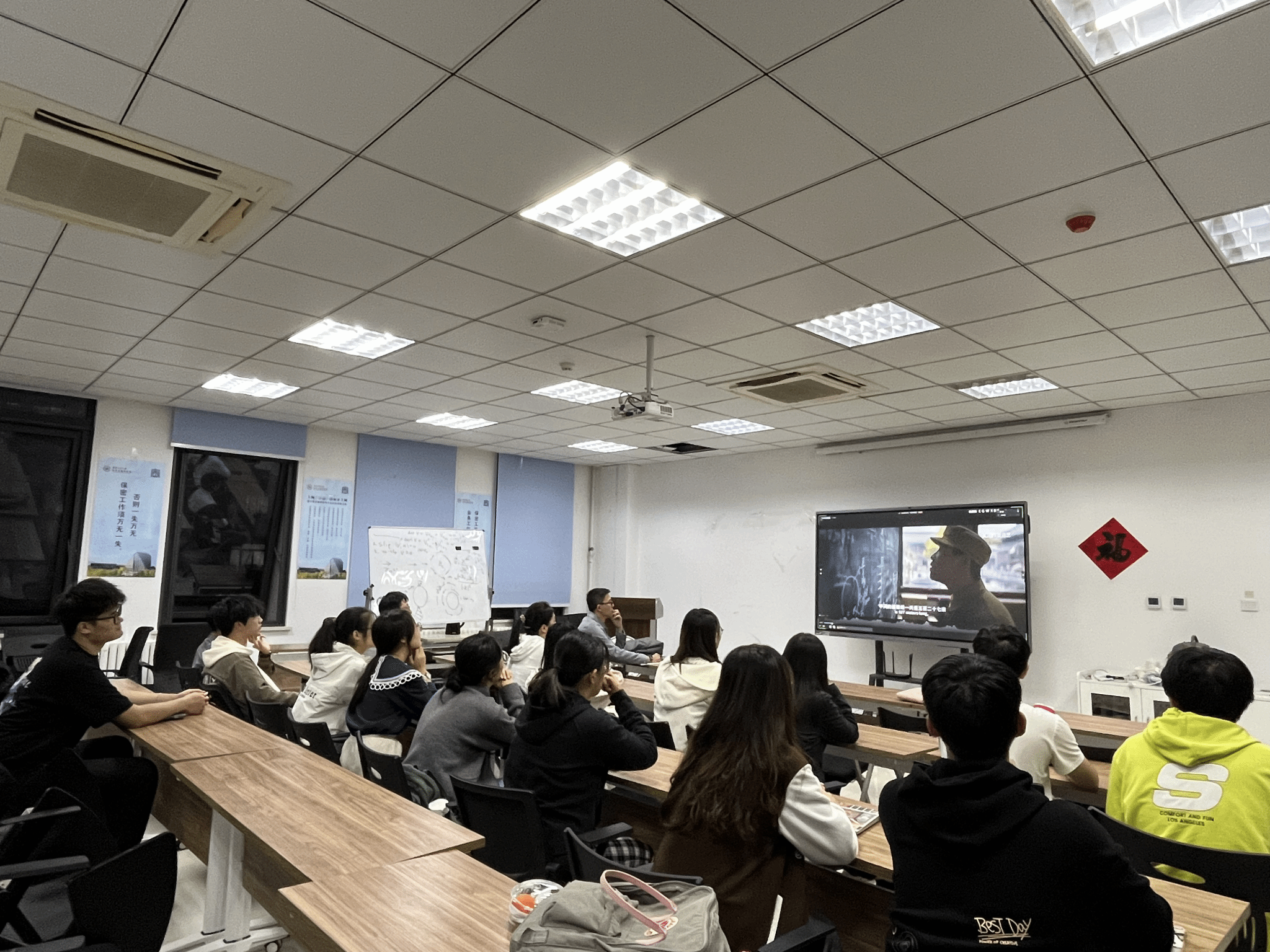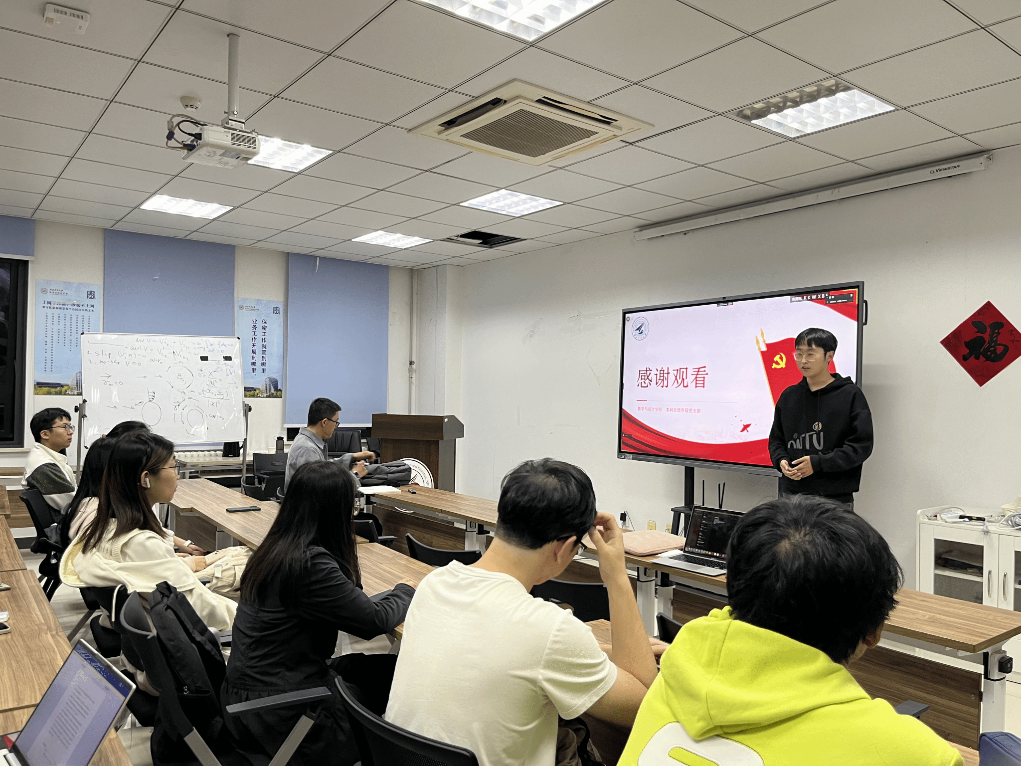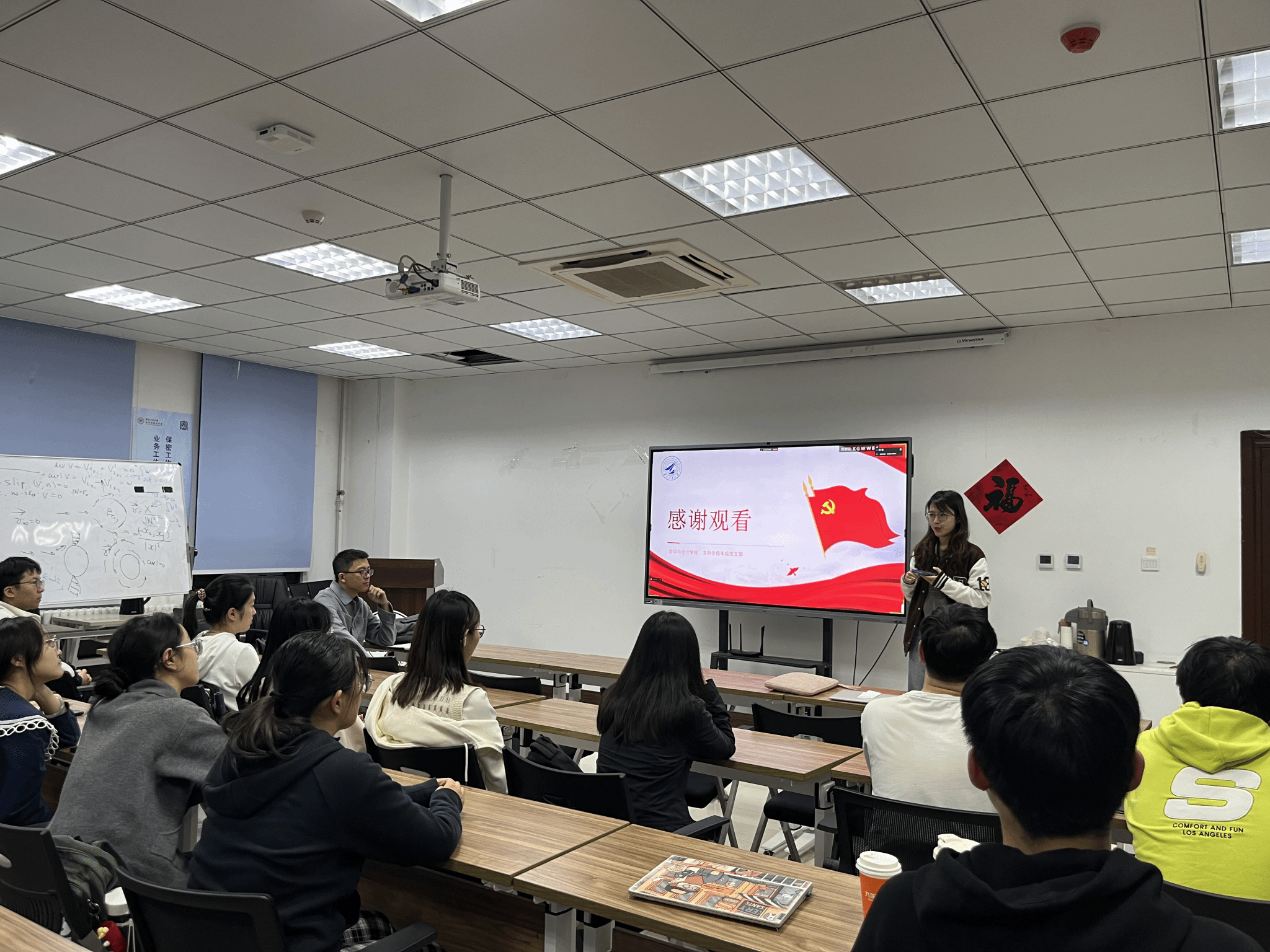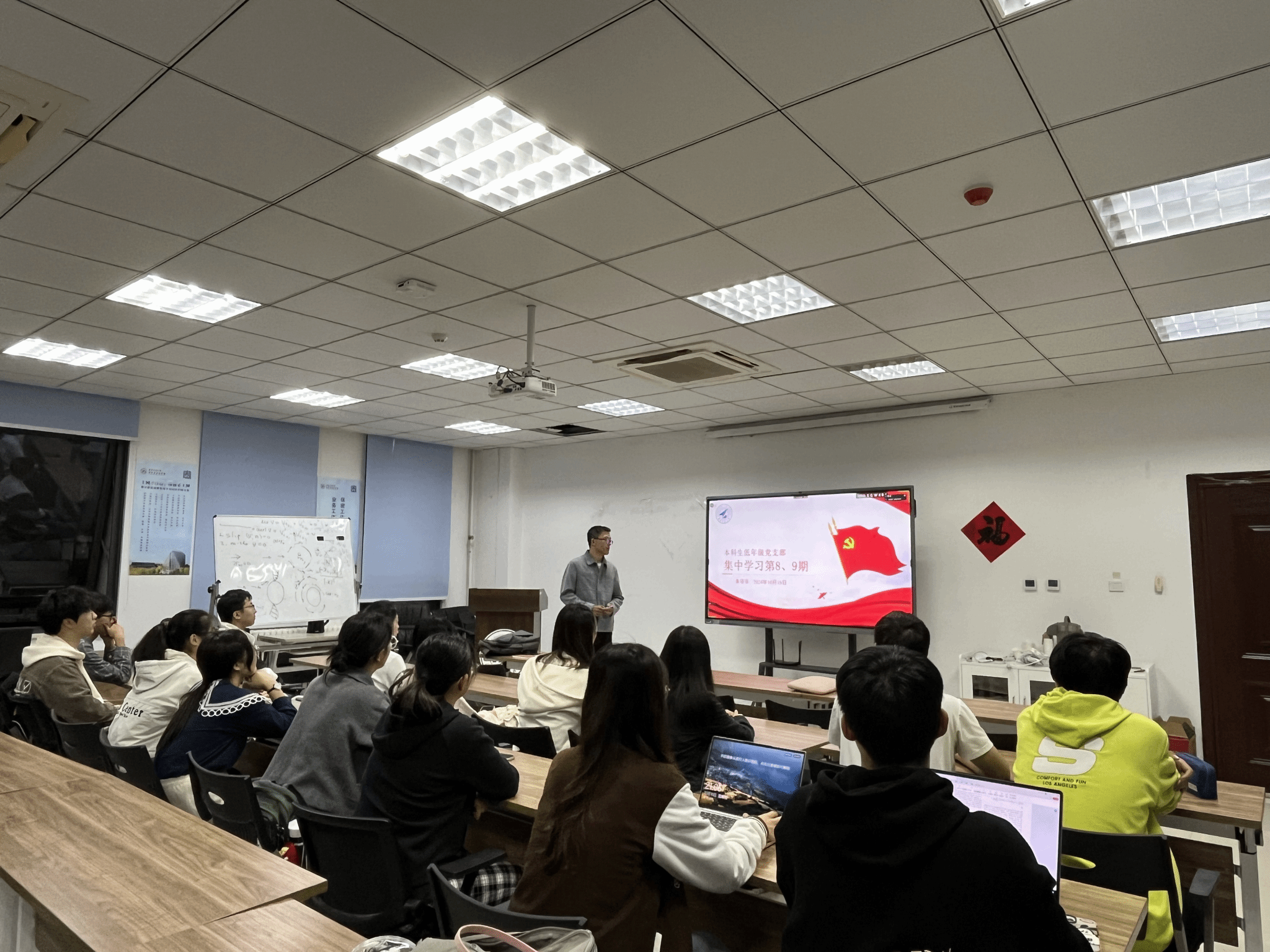 10月18日晚,2026世界杯指定网站本科生低年级党支部在启翔楼357组织“感恩祖国,成长成才”庆祝新中国成立75周年主题党日活动,通过党课+观影+经验分享,引领支部成员深刻领悟习近平总书记的重要论述,深入地了解祖国的发展历程和辉煌成就,将思想教育与实践体验有机结合,把爱国情怀转换为求知问学的动力。