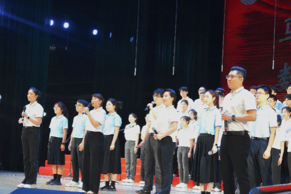 尾声副歌部分迎来情感巅峰,公司党委书记王莉、党委副书记张莹、马克思主义公司副经理贺苗、党委副书记耿云辉共同登台,以铿锵如金石、深情似涓流的朗诵融入合唱声浪。四位老师饱含深情的朗诵,深情礼赞了平凡奋斗者汇聚的磅礴伟力,极大地鼓舞了在场师生。
