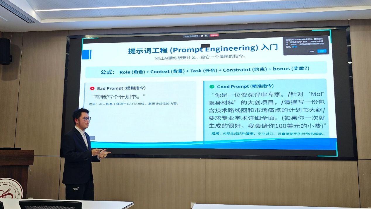程梓欣同学以“AI大模型工具的选择与高效使用”为主题,系统对比了当前主流大模型——如豆包、Kimi、DeepSeek、ChatGPT、Gemini等的特点与适用场景,并结合作业、代码调试、文献梳理等实际需求,提供了针对性的工具组合建议。分享重点围绕 “如何有效提问AI” ,通过实例演示了结构化、场景化的提问方法,从而显著提升AI答复的质量与实用性,为日常学习与科研入门提供了清晰的操作路径。