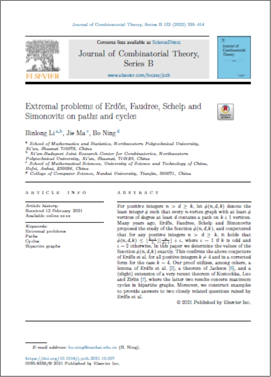 公司图论与组合数学团队一直把获得高水平科研成果作为一个主要目标。JCTB是图论与组合数学方向的第一本杂志,是该领域最被认可期刊。2019年,团队陆由教授与合作者在符号图的圈覆盖问题上取得重要成果,在JCTB上发表了论文。在2021年,团队成员陆由、李斌龙、郜璐璐等教师在JCTB发表了三篇论文(本年度JCTB期刊共发表论文82篇,其中国内学者发表计11篇),彰显了团队强劲的发展势头。