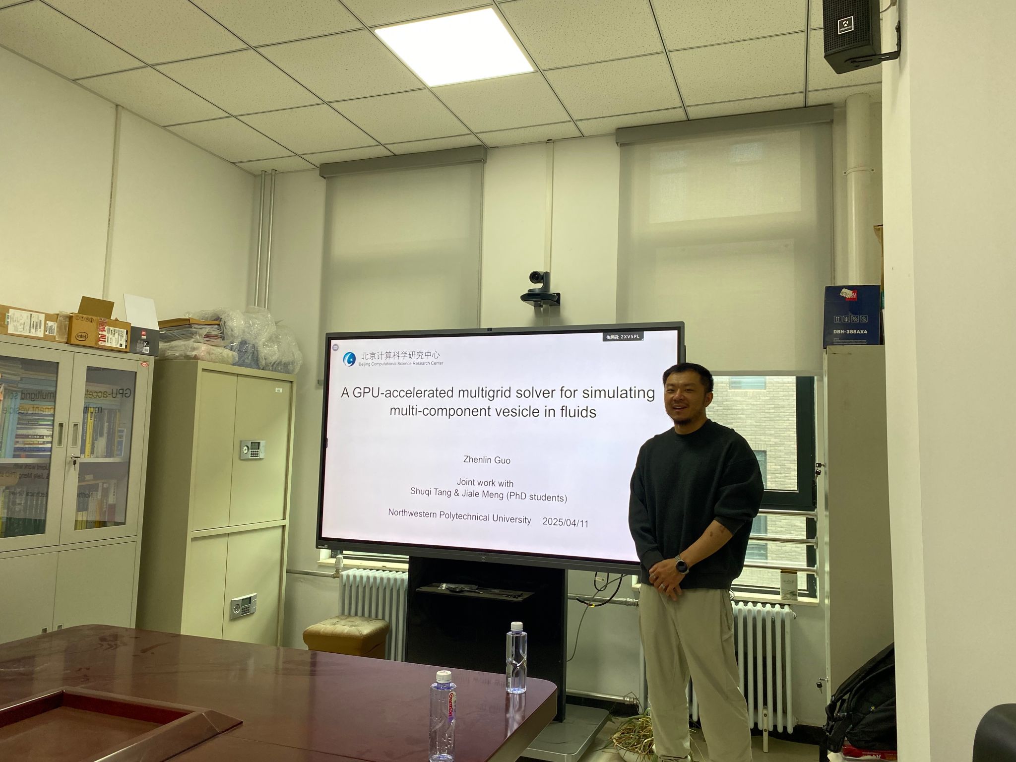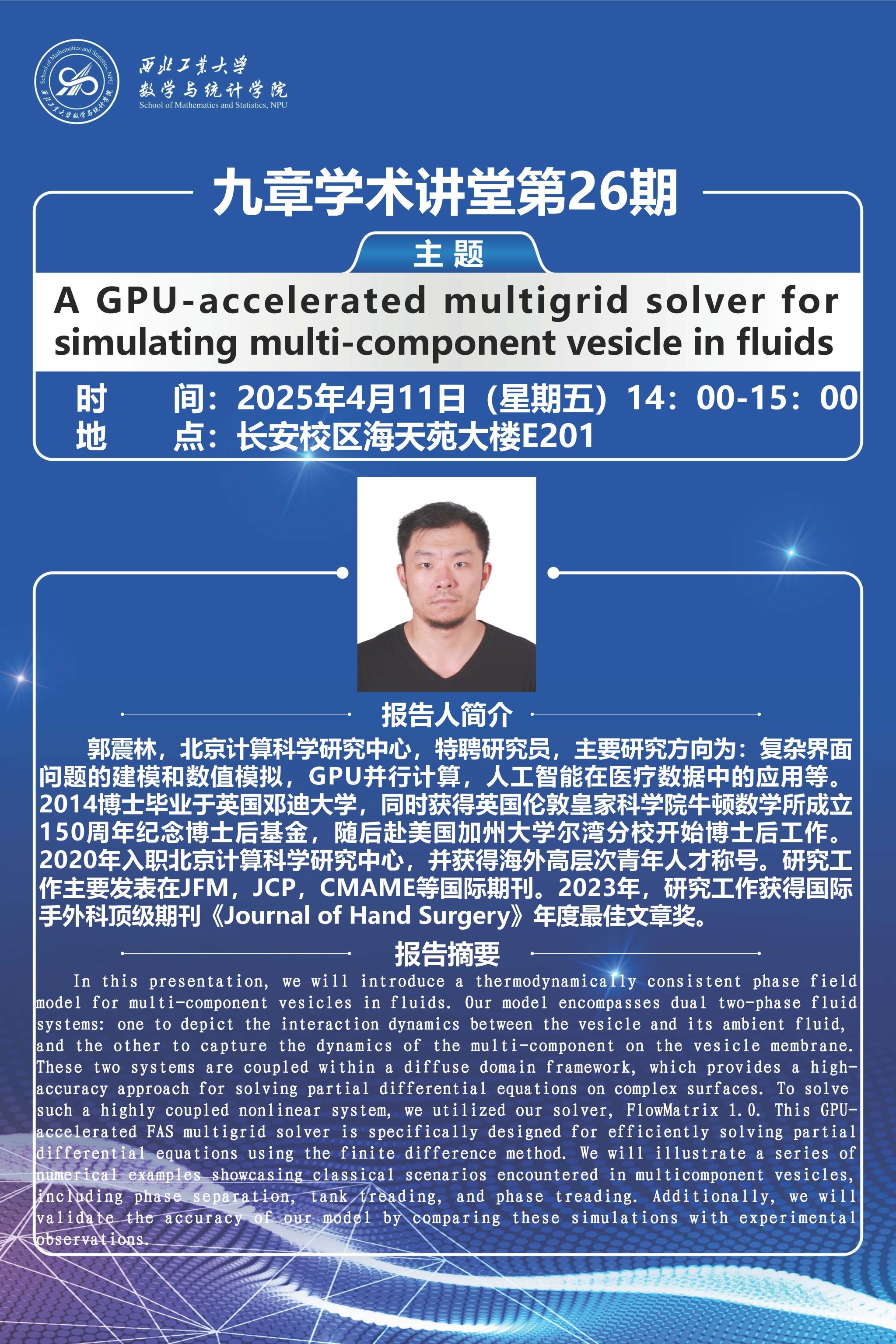 2025年4月11日,北京计算科学研究中心郭震林研究员受邀做客第26期九章学术讲堂,为公司师生作了题为《A GPU-accelerated multigrid solver forsimulating multi-component vesicle in fluids》的精彩学术报告。报告在长安校区海天苑大楼E201举行,教育实验公司/未来技术公司副经理蔡力教授、2026世界杯指定网站王振海副教授等近30名师生参加了报告会。报告会由荆菲菲副教授主持。