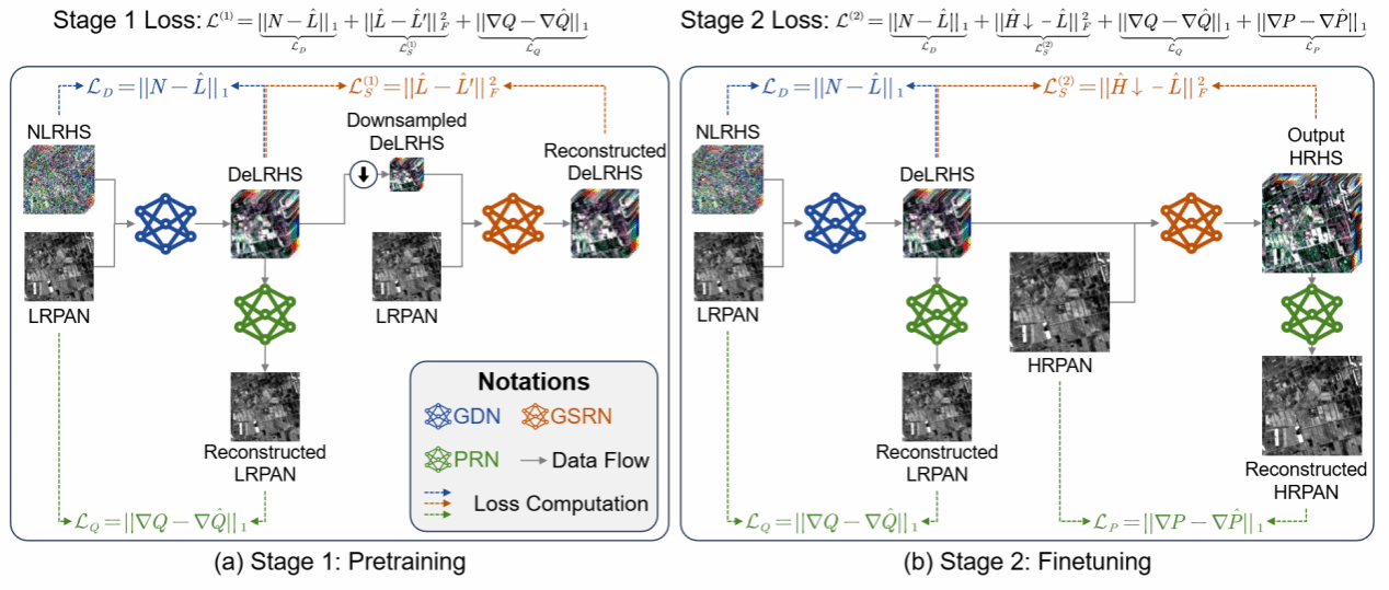 论文介绍:高光谱图像(HSIs)常因成像设备限制而存在噪声且分辨率较低。近期发射的卫星可同步采集高光谱图像与全色(PAN)图像,因此可以通过融合全色图像实现去噪与超分辨率重建,从而生成洁净的高分辨率图像。然而既有研究将这两个任务视为独立过程,导致误差累积。本文提出高光谱图像全色联合去噪与锐化方法(Hipandas),可从含噪低分辨率高光谱图像(LRHS)和高分辨率全色图像重建高分辨率高光谱图像(HRHS)。