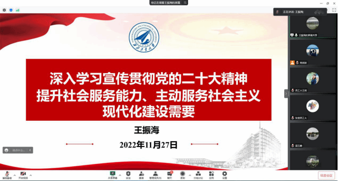 党委副书记张莹谈到,党的二十大报告中指出,教育、科技、人才是全面建设社会主义现代化国家的基础性、战略性支撑。作为新时代教育科研工作者,要以习近平新时代中国特色社会主义思想为引领,把握以员工需求为中心的基本内涵,明确时代需求,进一步增强为党育人、为国育才的政治觉悟与担当,切身引导青年员工积极投身于科教兴国、人才强国的伟大实践,为建设世界重要人才中心和创新高地提供有力支撑。