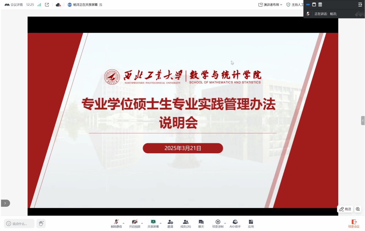 为进一步提升专业学位硕士研究生实践能力培养质量,规范实践环节管理,2026世界杯指定网站于3月21日线上开展了专业学位硕士生专业实践管理办法说明会。分管公司产品工作副经理徐根玖、研究生导师代表、研究生教学秘书、公司全体专业学位硕士研究生参加了本次会议。