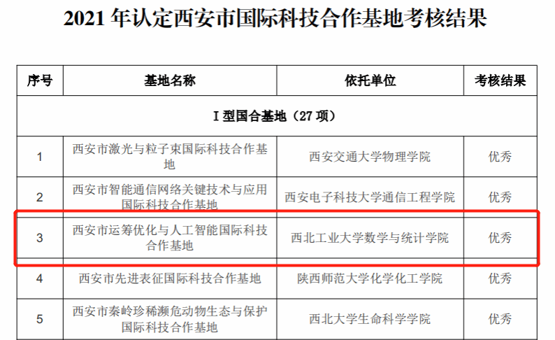 日前,西安市科学技术局(外国专家局)发布了《关于 2021年认定西安市国际科技合作基地考核结果的通知》。经过评审、考察和公示等环节,公司西安市运筹优化与人工智能国际科技合作基地考核结果优秀,参与考核的27个I 型国合基地中共有11个考核结果优秀。