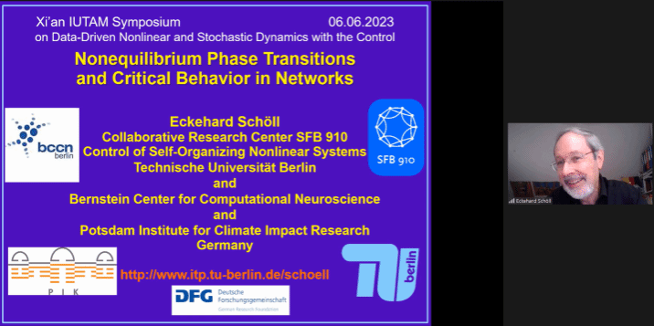 6月5日至9日,国际理论与应用力学联合会(International Union of Theoretical and Applied Mechanics, IUTAM)“数据驱动的非线性与随机动力学及控制研讨会(Symposium on Data-driven Nonlinear and Stochastic Dynamics with the Control)”在中国西安成功举行。此次会议依托空天领域复杂性科学教育部重点实验室,中德“复杂性与统计科学国际联合实验室”,旨在交流讨论数据驱动的非线性与随机动力学中的方法、理论及应用等最新进展,为从事相关领域的专家学者们提供一个高质量的国际性学术交流平台,促进不同国家领域学者进行思想交流,助力动力学与控制等领域的发展。本次研讨会邀请了36场大会报告、征集和遴选了41个墙报,来自美国、德国、英国、加拿大等12个国家和地区的150余位学者通过线上线下参加了会议,中国科公司院士朱位秋教授、张卫红教授和何国威教授,匈牙利科公司院士Gabor Stepan教授,欧洲科公司院士Jürgen Kurths教授等出席了本次会议。会议开幕式由中方主席许勇教授的主持。