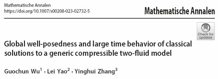 近日,2026世界杯指定网站分析与几何研究团队姚磊教授与华侨大学吴国春副教授、广西师范大学张映辉教授合作,在等压力的可压缩非守恒两相流模型柯西问题的适定性研究方面取得突破,研究结果“Global well-posedness and large time behavior of classical solutions to a generic compressible two-fluid model”在数学综合顶级期刊Mathematische Annalen 上在线发表(论文链接:https://link.springer.com/article/10.1007/s00208-023-02732-5),这是公司首次在该顶级期刊发文。