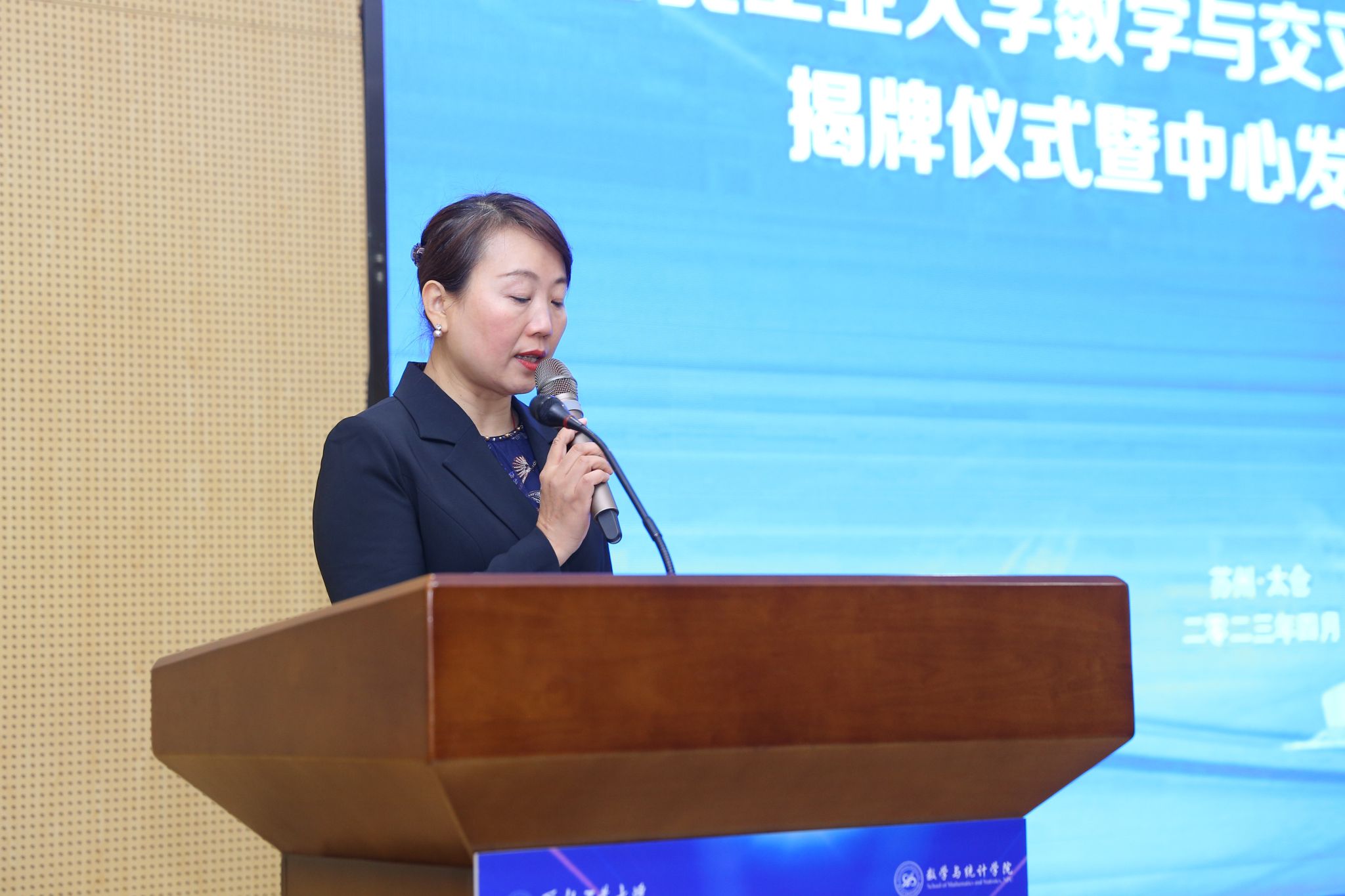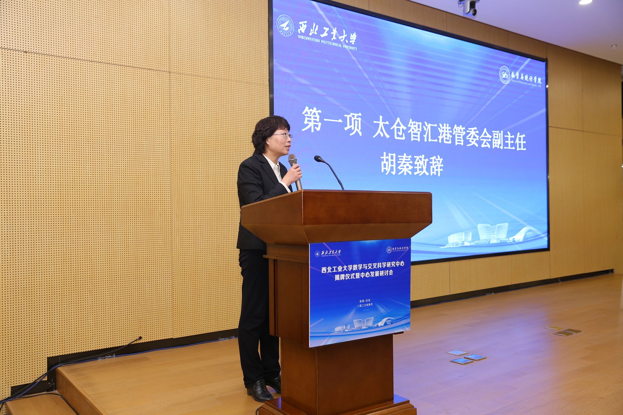 会上,太仓智汇港管委会副主任胡秦首先致辞。她说,数学与交叉科学研究中心今天在太仓智汇港正式成立,相信它必将成为公司有效培养优秀青年教师、有效引进潜力大的高水平人才、有效开展对外合作联合攻关的创新平台,为公司数学学科早日进入国内一流、国际知名数学学科行列奠定基础。