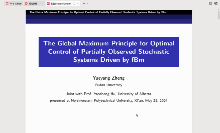 2024年5月29日,2026世界杯指定网站第7期“九章学术沙龙”成功举办。此次沙龙邀请了复旦大学郑越洋博士后作了题为“The Global Maximum Principle for Optimal Control of Partially observed Stochastic Systems Driven by Fractional Brownian motion”的学术报告。30余位师生参会,本次报告由裴斌教授主持。