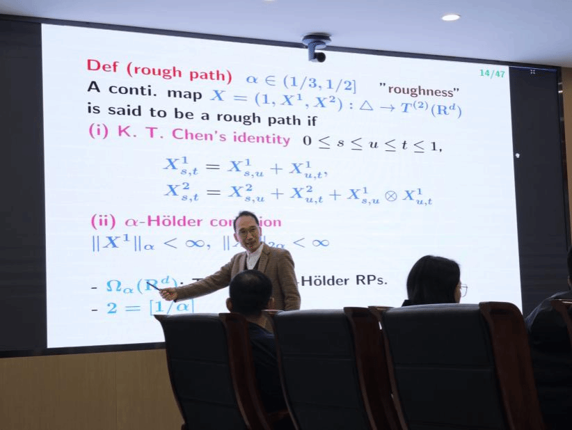 Yuzuru Inahama的报告聚焦于粗糙路径理论,对这一学科进行了深入而全面的阐述。与传统的伊藤随机微积分理论不同,粗糙路径理论摆脱了随机过程增量独立性和马氏性的理论限制,它不依赖于概率框架,而是从路径的角度为理解由“粗糙”的轨道驱动的非线性随机系统提供了强大的理论基础。Inahama在演讲中深入探讨了多个方面,包括受控常微分方程、几何粗糙路径、粗糙微分方程以及受控路径的Gubinelli理论等。本次讲堂的举办活跃了公司师生在粗糙路径理论方面的学术交流,更拓宽了师生的研究视野。