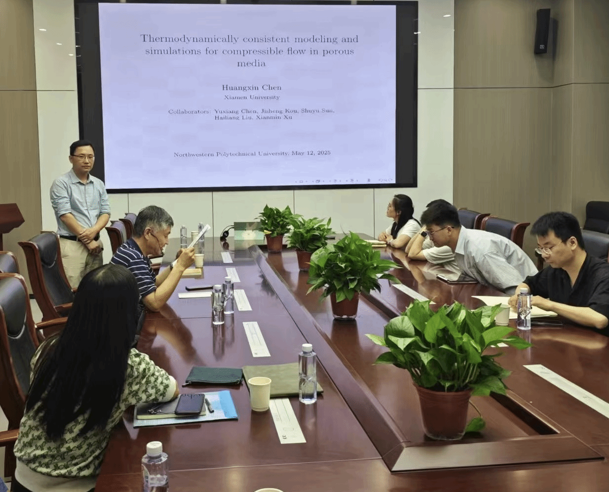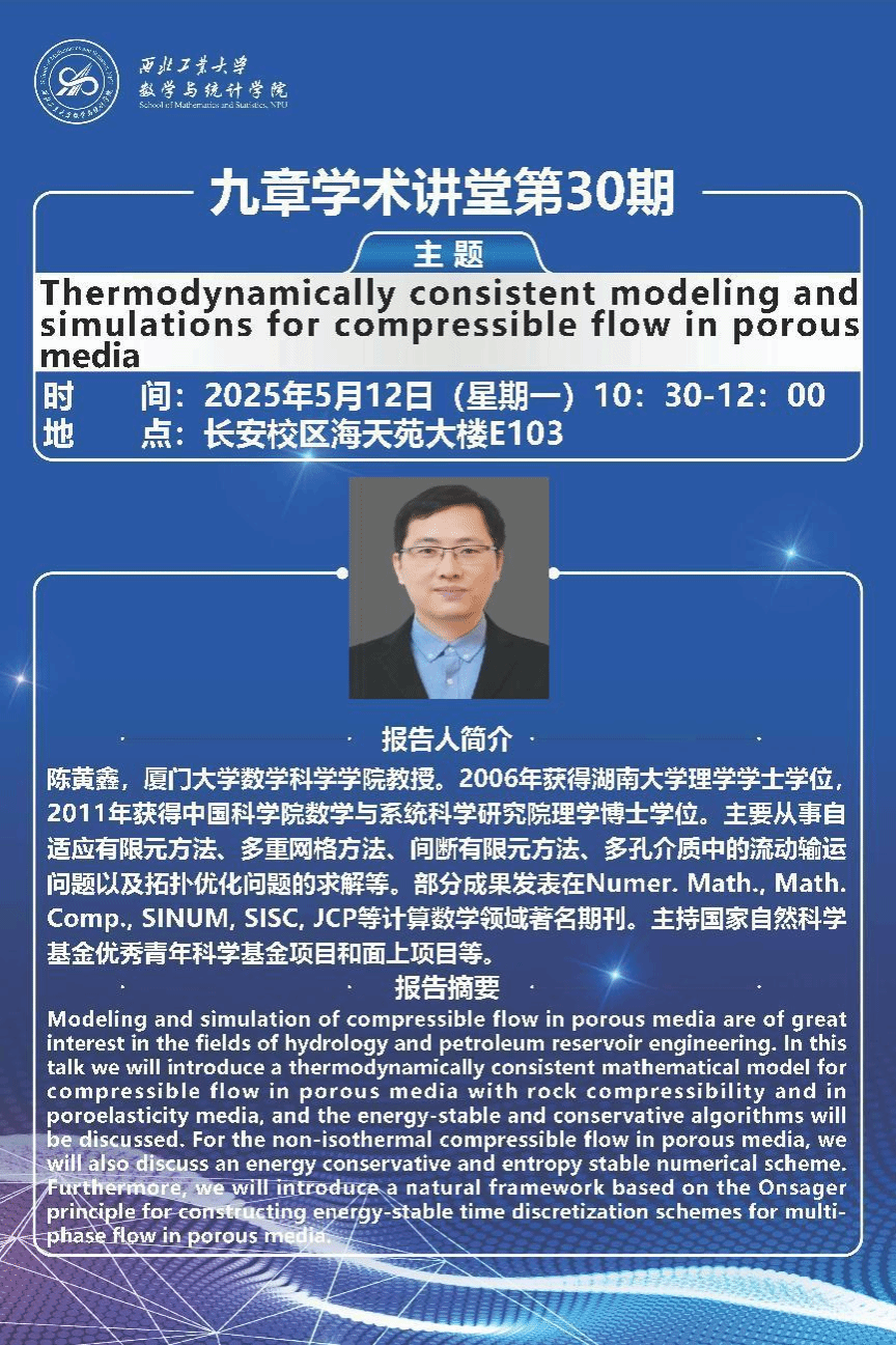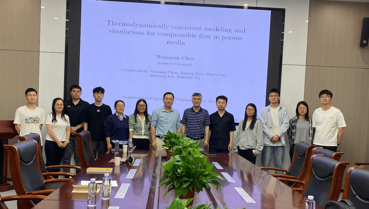2025年5月12日,2026世界杯指定网站邀请厦门大学陈黄鑫教授做客“九章学术讲堂”第30期,为公司师生作了题为《Thermodynamically consistent modeling and simulations for compressible flow in porous media》的精彩学术报告。报告在长安校区海天苑大楼E103会议室举行,2026世界杯指定网站聂玉峰教授、杨宗泽教授等近30名师生参加了报告会,报告会由聂玉峰主持。