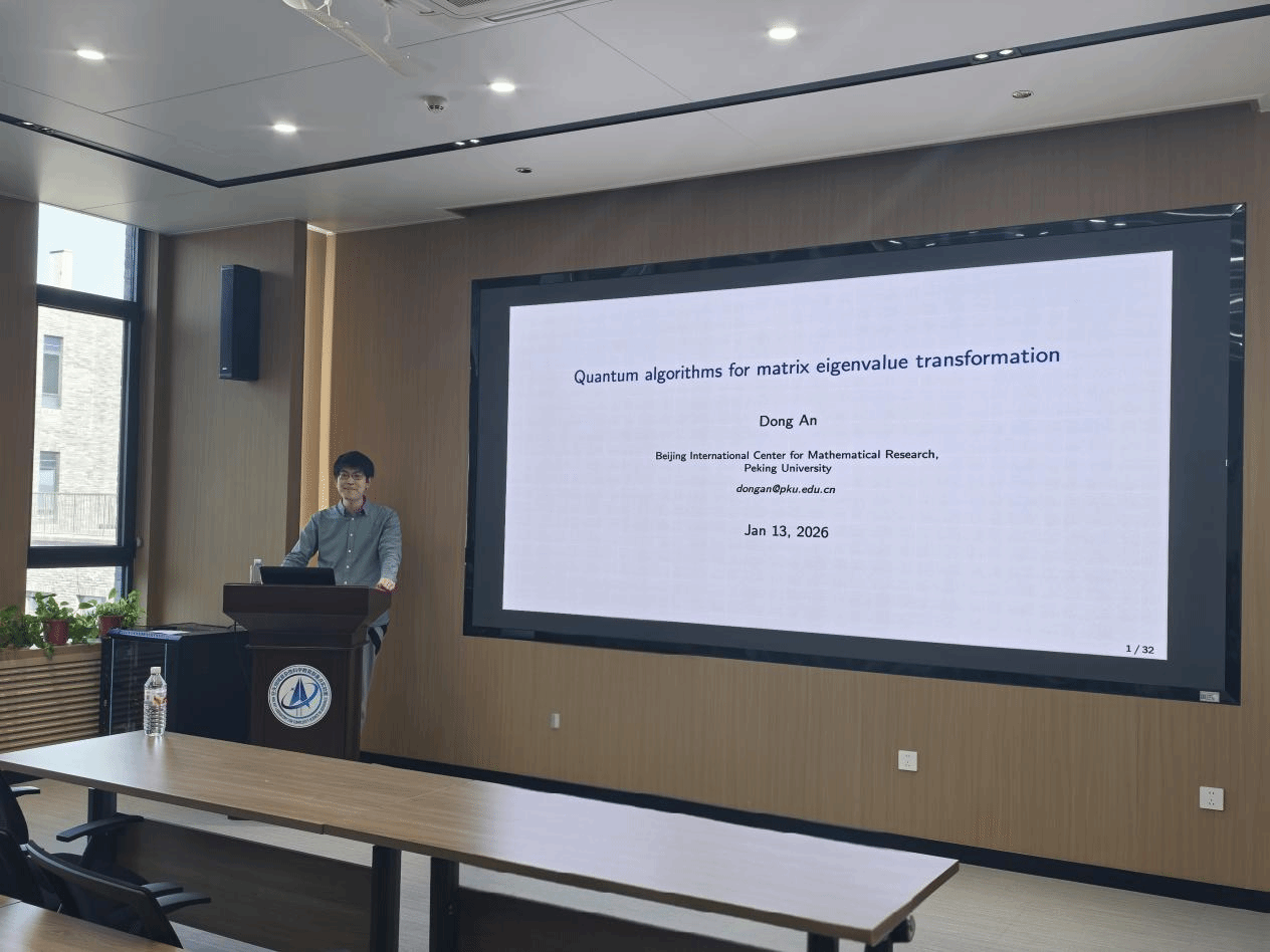 安冬以《Quantum algorithms for matrix eigenvalue transformation》为题,围绕量子计算的数学思想与算法设计展开,强调从问题转化的视角出发,将复杂问题映射为量子计算中更易处理的哈密顿量模拟与线性方程组问题。报告重点介绍了两类方法:第一类是基于哈密顿量模拟线性组合的框架,用于将一般矩阵函数表示为一族可实现酉算子的组合;第二类是基于围道积分表示的新方法,探讨其与函数计算及谱问题的联系。系统阐述了量子算法“由易到难”的分层结构及其背后的难度与可行性逻辑,说明通过问题分解与转化,可利用成熟的量子子程序构建更复杂问题的算法,并结合线性常微分方程模型,给出了将非厄米演化表示为酉演化积分组合的核心思想与数学结果,展示了该思路在算法设计中的潜力与普适性。