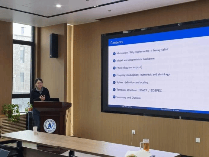 赵丹以《列维噪声驱动下高阶Kuramoto模型的同步跃迁与尖峰动力学》为题,探讨了在Lévy噪声驱动下的高阶Kuramoto模型中,同步态与失同步态的边界演化机制。报告通过对研究的高阶Kuramoto模型进行OA降维得到理论近似解,并分别观察在非噪声影响下、高斯白噪声影响下以及Lévy噪声影响下系统同步情况与概率密度分布。同时通过引入平均序参量、平均首次到达时间以及吸引子盆稳定性等指标,报告系统介绍了噪声参数等因素对系统稳定性的调控作用。对于序参量极端偏离导致的的尖峰动力学,她提出了一种基于编辑距离算法的广义谱分析框架,用于量化尖峰序列的相似程度并识别背后的动力学模式。其相关成果为非高斯噪声背景下复杂网络的同步相变与极端事件的研究提供了新的分析视角。
