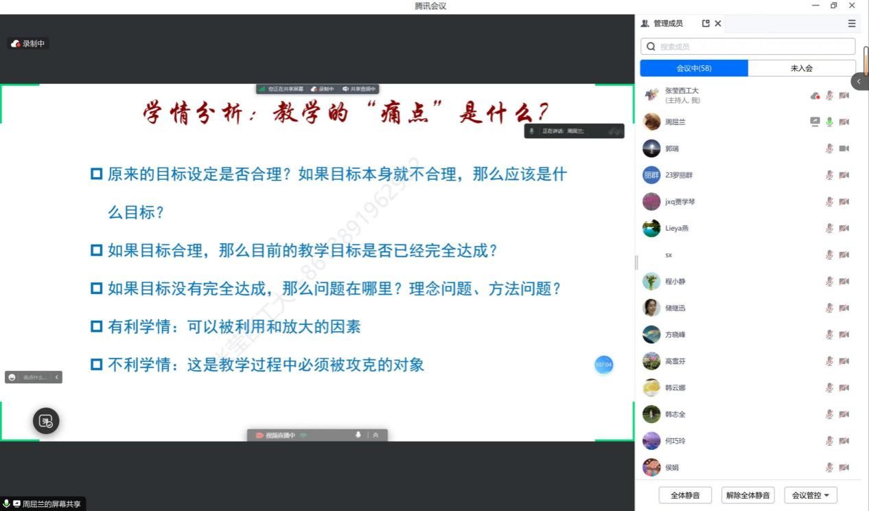 为了加强兄弟高校微积分课程教学间的沟通与联系,促进多学科交叉融合与教学经验分享,提高公司微积分任课教师教学水平,进一步提升公司人才培养质量。2023年6月29号微积分课程教学团队以线上线下相结合的形式举行了本学年的课程教学研讨会,暨基层教学组织示范点系列交流活动第三期和第四期。本次会议通过腾讯会议和雨课堂双平台同步直播,共百余位教师线上线下参会。