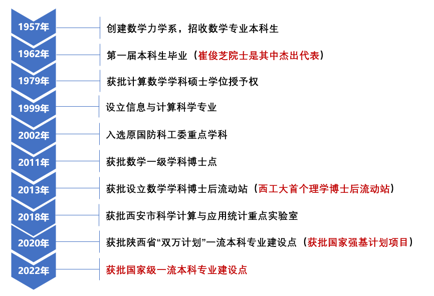 “信息与计算科学专业”于1999年设立,其前身为1957年数学力学系的应用数学和力学专业,1979年获批计算数学硕士学位授予权,2011年获批数学一级学科博士点,2013年获批设立数学学科博士后流动站。2020年获批陕西省“双万计划”一流本科专业建设点,入选国家强基计划。