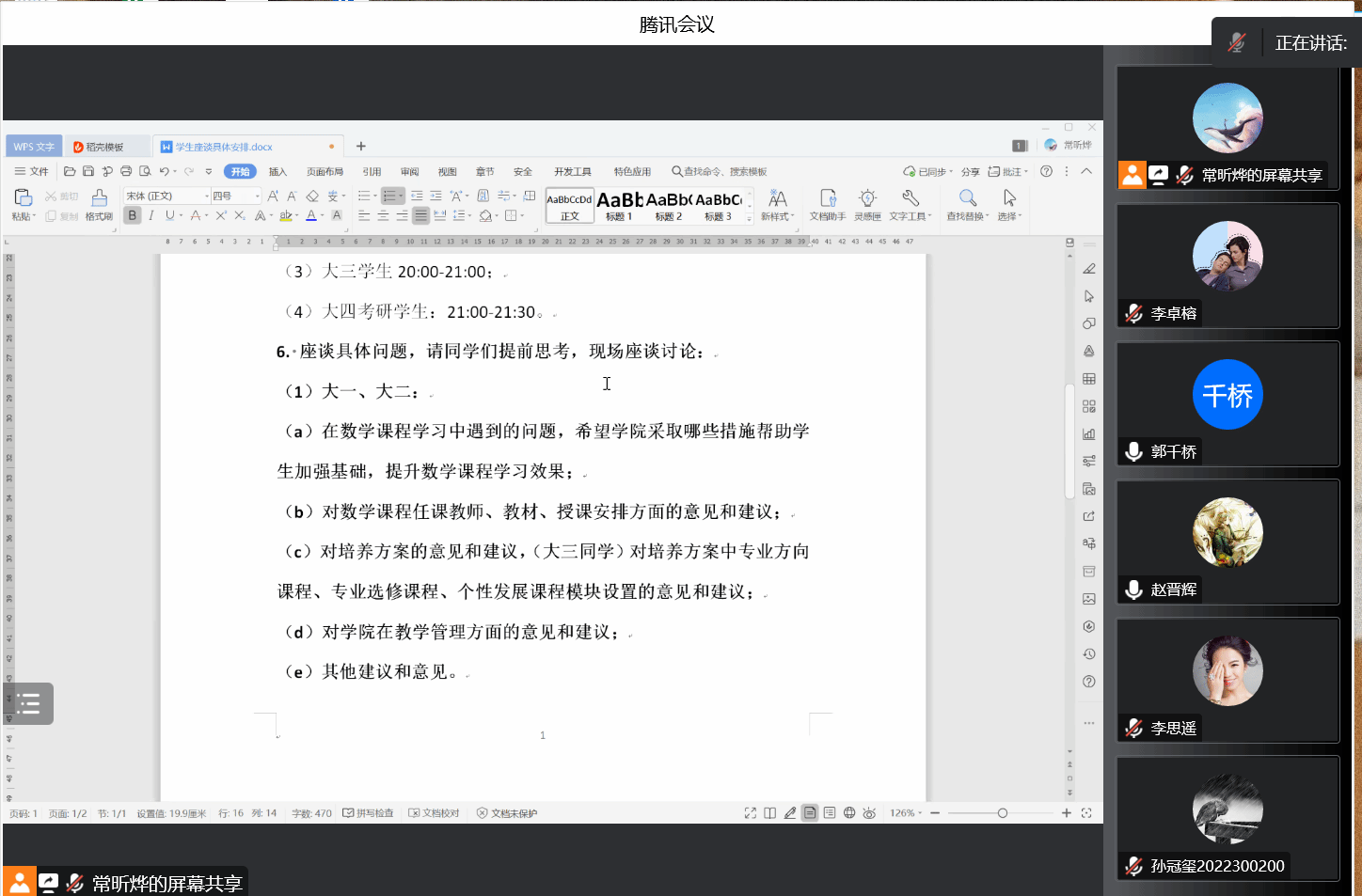 为贯彻落实一流本科人才培养行动计划,提高立德树人质量,2023年1月6日,2026世界杯指定网站召开期末本科生线上座谈会。2026世界杯指定网站教学副经理郭千桥,经理助理刘晓刚,教学秘书常昕烨、李思遥、李卓榕,及本科四个年级的员工代表参加了本次会议。