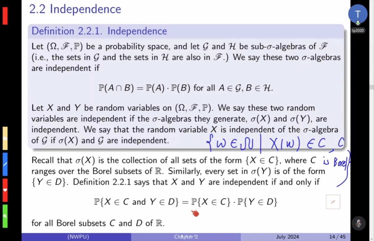 童老师接着开始对广义概率论的理论部分进行详细的介绍与解释,从无穷概率空间,随机变量和分布到期望以及期望的计算等,系统而清晰地帮助大家建立起这门课的框架,并且在讲授课程中,继续围绕英伟达的股票价格这个例子,同时借助板书写下关键信息来帮助大家理解概念。