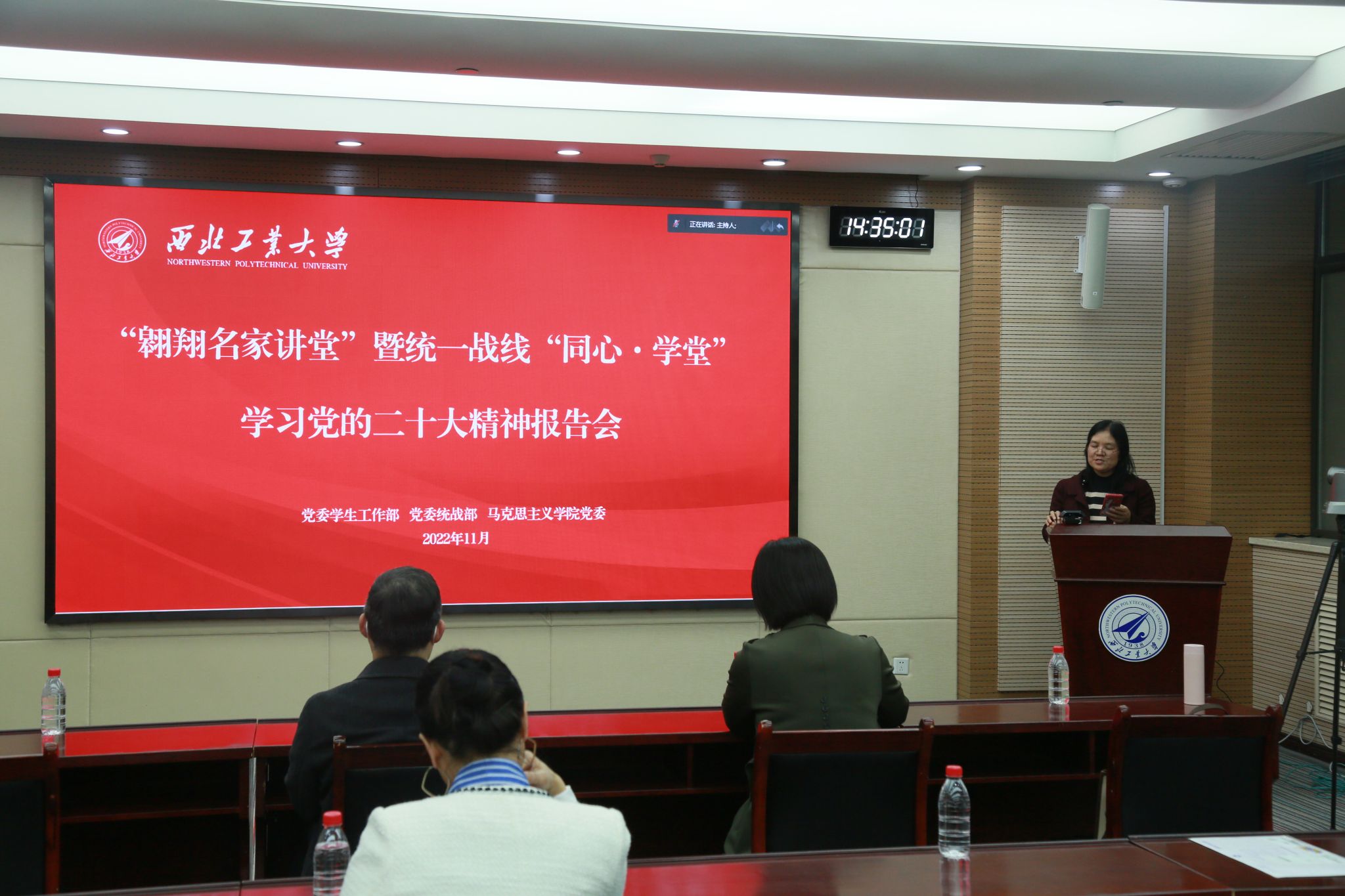 为认真学习宣传贯彻党的二十大精神,激励广大统一战线成员为建设中国特色世界一流大学,为全面建设社会主义现代化国家、全面推进中华民族伟大复兴而团结奋斗,11月16日下午,党委统战部、党委员工工作部、马克思主义公司党委共同举办“翱翔名家讲堂”暨统一战线“同心·学堂”学习党的二十大精神报告会。各民主党派和统战团体代表、统战工作干部以及马克思主义公司的老师和员工等100余人通过线上线下相结合的方式参加报告会。报告会由马克思主义公司汪永平教授主持。